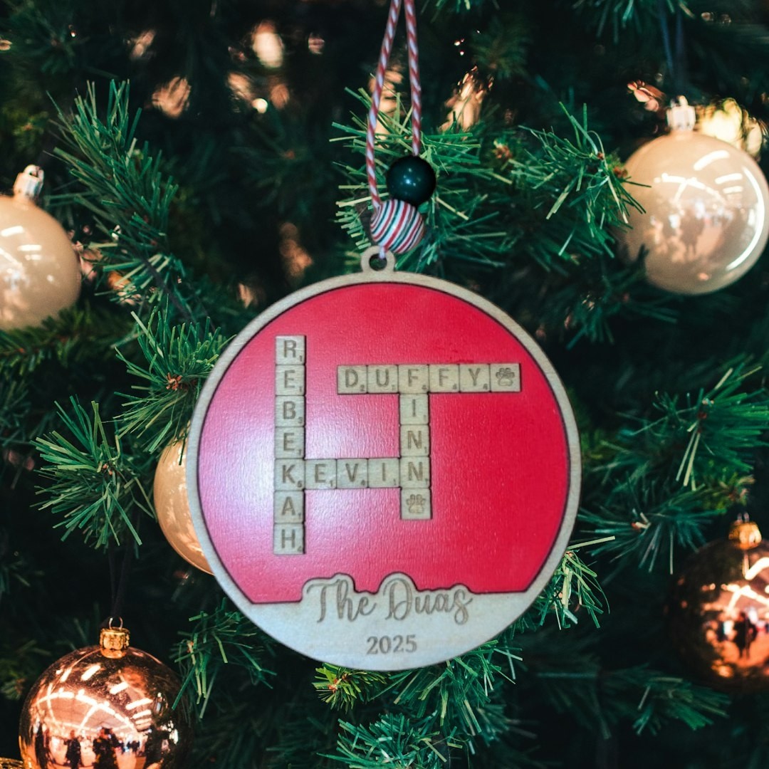 Your family’s names are arranged in a crossword-style layout using mini tile-inspired letters. Add your last name and the year, and boom — instant heirloom. It hangs from a festive twine loop with bead accents that give it that “I actually planned my holiday décor this year” vibe.